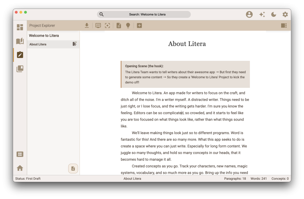 Litera is a simplified editor with a minimal UI, so you can focus on what matters most. The writing! No clunky editors. No Distractions. Just writing.